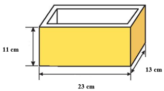 Một khuôn đúc bê tông có lích thước như hình vẽ. Bề dày các mặt bên của khuôn là \(1,2{\mkern 1mu} cm.\) Bề dày mặt đáy của khuôn là \(1,9{\mkern 1mu} cm.\) Thể tích của khối bê tông được khuôn này đúc ra là bao nhiêu xăngtimét khối?