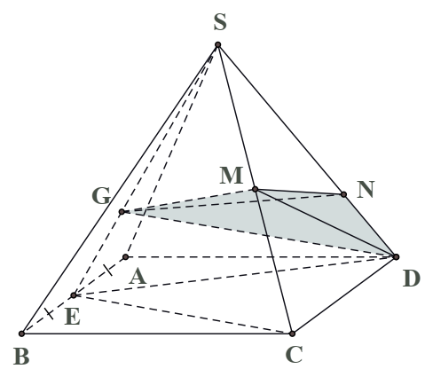 Cho khối chóp S.ABCD có đáy là hình bình hành. Gọi M, N là hai điểm nằm trên hai cạnh $S C, S D$ sao cho \(\dfrac{{SM}}{{SC}} = \dfrac{1}{2},\dfrac{{SN}}{{ND}} = 2\), biết G là trọng tâm tam giác SAB. Tính tỉ số thể tích \(\dfrac{{{V_{G.MND}}}}{{{V_{S.ABCD}}}}\).
