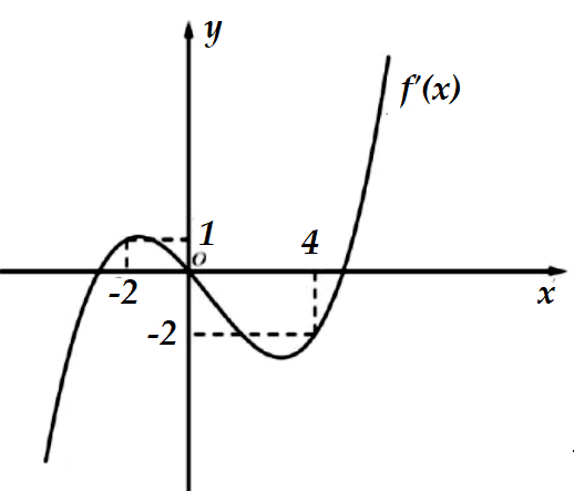 Cho hàm số bậc bốn \(y = f(x)\) có đồ thị hàm số \(y = f'(x)\) như hình vẽ bên. Hàm số \(g(x) = 4f\left( {{x^2} - 4} \right) + {x^4} - 8{x^2}\) có bao nhiêu điểm cực tiểu?
