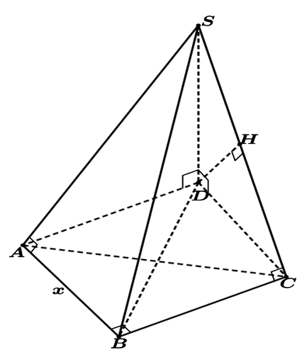 Tính \({V_{S.ABC}} = \dfrac{1}{3}SD.{S_{\Delta ABC}}\) theo a, x.