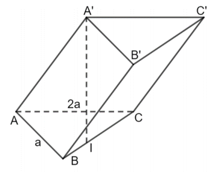 Cho hình lăng trụ \(ABC.A'B'C'\) có đáy \(ABC\) là tam giác vuông tại \(A,AB = a,AC = 2a\) (tham khảo hình bên). Hình chiếu vuông góc của \(A'\) lên mặt phẳng \(\left( {ABC} \right)\) là điểm \(I\) thuộc cạnh \(BC\). Khoảng cách từ \(A\) tới mặt phẳng \(\left( {A'BC} \right)\) bằng
