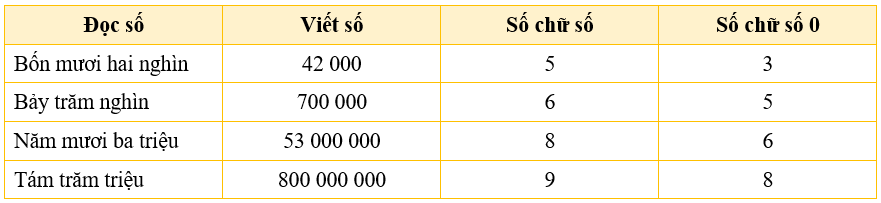 Viết các số sau rồi cho biết mỗi số có bao nhiêu chữ số, bao nhiêu chữ số 0: