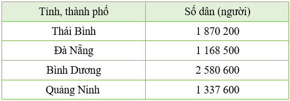 Bảng dưới đây cho biết thông tin về dân số của một số tỉnh, thành phố ở nước ta năm