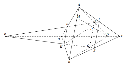 a) Tìm giao điểm E của CD với $\left( IJK \right)$. Chứng minh: \(DE=DC\).