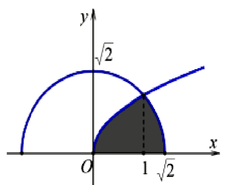 Cho \((H)\) là hình phẳng giới hạn bởi đường cong có phương trình \(y = \sqrt x \), nửa đường tròn có phương trình \(y = \sqrt {2 - {x^2}} \) (với \(0 \le x \le \sqrt 2 \) ) và trục hoành (phần tô đậm trong hình vẽ). Diện tích của hình \((H)\) bằng: