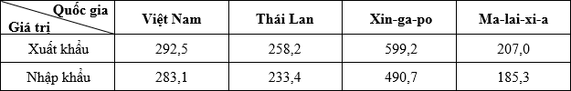 Cho bảng số liệu: GIÁ TRỊ KIM NGẠCH XUẤT, NHẬP KHẨU CỦA MỘT SỐ NƯỚC ĐÔNG NAM Á NĂM
