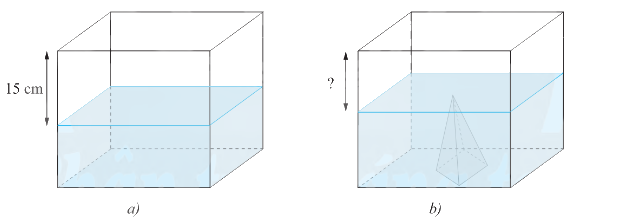 Một bể kính hình hộp chữ nhật chứa nước có hai cạnh đáy là 50 cm và 40 cm, khoảng cách từ mực nước tới miệng bể là 15 cm. Người ta dự định đặt vào bể một khối đá hình chóp tứ giác đều cạnh đáy là 20 cm, chiều cao 15 cm. Khi đó khoảng cách mực nước tới miệng bể là bao nhiêu? Biết rằng sau khi đặt khối đá vào, nước ngập khối đá và không tràn ra ngoài.