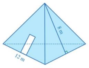 Một kho chứa có dạng hình chóp tam giác đều với độ dài cạnh đáy khoảng 12 m và đường cao mặt bên kẻ từ đỉnh là 8 m (Hình dưới). Người ta muốn sơn phủ bên ngoài cả ba mặt xung quanh của kho chứa đó và không sơn phủ phần làm cửa có diện tích là 5 \({m^2}\). Biết rằng cứ mỗi mét vuông sơn cần trả 30 000 đồng. Cần phải trả bao nhiêu tiền để hoàn thành việc sơn phủ đó?