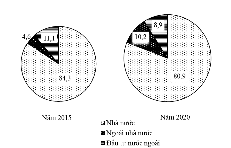 Cho biểu đồ về sản lượng điện phát ra phân theo thành phần kinh tế của nước ta, năm 2015 và 2020 (Đơn vị: %):