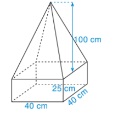 Một khối bê tông có dạng như Hình bên dưới. Phần dưới của khối bê tông có dạng hình hộp chữ nhật, đáy là hình vuông có cạnh 40 cm, chiều cao 25 cm. Phần trên của khối bê tông có dạng hình chóp tứ giác đều, chiều cao 100 cm. Tính thể tích của khối bê tông đó.