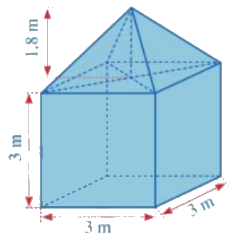 Hình dưới đây mô tả một chiếc lều trại phần dưới có dạng hình lập phương với cạnh là 3m phần trên có dạng hình chóp tứ giác đều với chiều cao là 1,8m. Tính thể tích của lều đó.