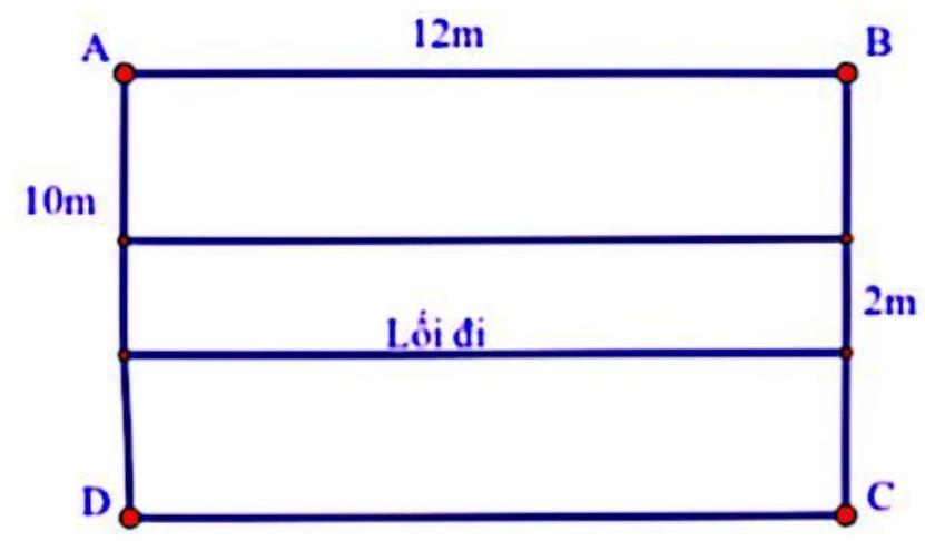 Một mảnh vườn hình chữ nhật \({\rm{ABCD}}\) có chiều dài cạnh bằng \(12{\rm{\;m}}\), chiều rộng \(10{\rm{\;m}}\). Người ta đề một phần mảnh vườn làm lối đi rộng \(2{\rm{\;m}}\) (như hình vẽ), phần còn lại đề trồng rau.