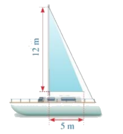 Hình bên mô tả một cánh buồm có dạng tam giác vuông, được buộc vào cột buồm thẳng đứng, với độ dài hai cạnh góc vuông là 12 m và 5 m. Tính chu vi và diện tích của cánh buồm đó.