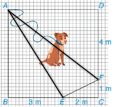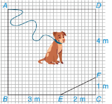 Chú cún bị xích bởi một sợi dây dài 6 m để canh một mảnh vườn giới hạn bởi các điểm A, B, E, F, D trong hình vuông ABCD có cạnh 5 m như Hình dưới. Đầu xích buộc cố định tại điểm A của mảnh vườn. Hỏi chú cún có thể chạy đến tất cả các điểm của mảnh vườn mình phải canh không?