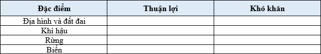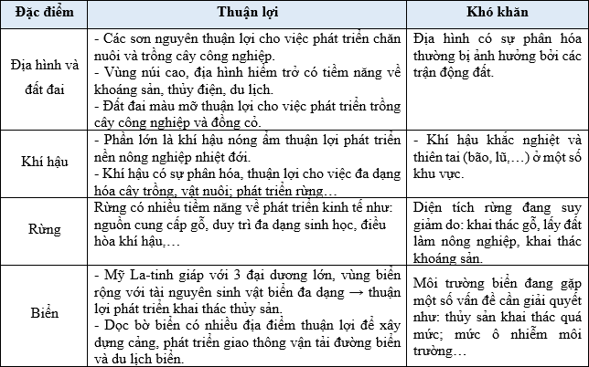 Hãy hoàn thành thông tin trong bảng sau về những thuận lợi và khó khăn của đặc điểm tự nhiên và tài nguyên thiên nhiên để phát triển kinh tế xã hội khu vực Mỹ Latinh.