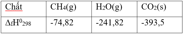 Biến thiên enthalpy chuẩn của phản ứng CH4(g) + 2O2(g) → CO2(s) + 2H2O(g) là