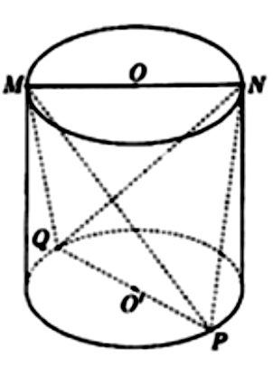 Một người thợ có một khối đá hình trụ. Kẻ hai đường kính MN, PQ lần lượt trên hai đáy sao cho \(MN \bot PQ\). Người thợ đó cắt khối đá theo các mặt cắt đi qua 3 trong 4 điểm M, N, P, Q để thu được khối đá có hình tứ diện MNPQ. Biết rằng MN = 80cm và thể tích khối tứ diện MNPQ bằng \(64\,\,{\rm{d}}{{\rm{m}}^3}\). Tìm thể tích của lượng đá bị cắt bỏ (làm tròn kết quả đến 1 chữ số thập phân).