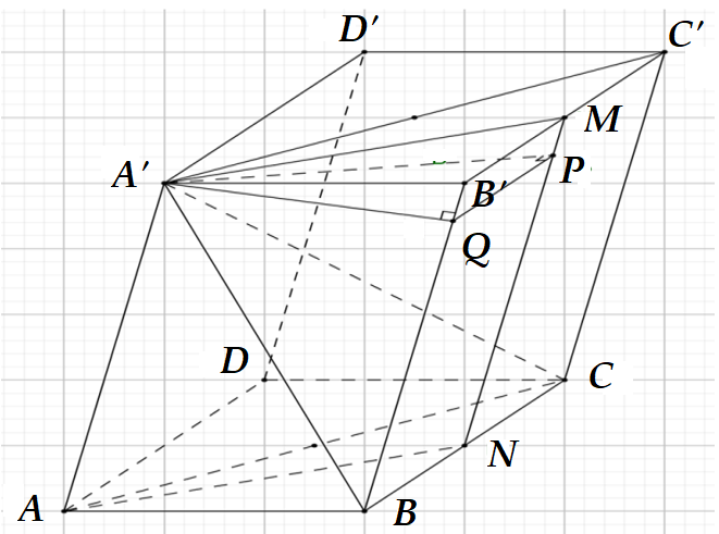 Cho hình lăng trụ tứ giác ABCD.A’B’C’D’ có đáy là hình thoi cạnh a, \(\angle BAD = {120^0}\).