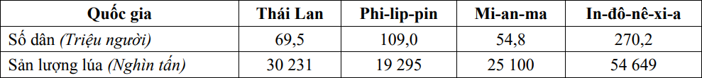 Cho bảng số liệu:SỐ DÂN VÀ SẢN LƯỢNG LÚA MỘT SỐ QUỐC GIA ĐÔNG NAM Á NĂM 2020 (Nguồn: Niên