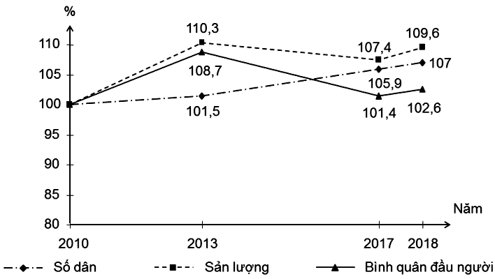 Cho biểu đồ số dân, sản lượng và bình quân lương thực đầu người của nước ta, giai đoạn 2010 - 2018: