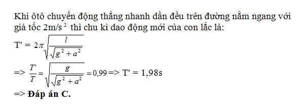(CĐ - 2010): Treo con lắc đơn vào trần một ôtô tại nơi có gia tốc trọng trường g = 9,8 m/s2. Khi ôtô đứng yên thì chu kì dao động điều hòa của con lắc là 2 s. Nếu ôtô chuyển động thẳng nhanh dần đều trên đường nằm ngang với giá tốc 2 m/s2 thì chu kì dao động điều hòa của con lắc xấp xỉ bằng