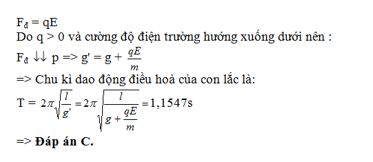 (ĐH – 2010): Một con lắc đơn có chiều dài dây treo 50 cm và vật nhỏ có khối lượng 0,01 kg mang điện tích q = +5.10-6C được coi là điện tích điểm. Con lắc dao động điều hoà trong điện trường đều mà vectơ cường độ điện trường có độ lớn E = 104V/m và hướng thẳng đứng xuống dưới. Lấy g = 10 m/s2, π = 3,14. Chu kì dao động điều hoà của con lắc là