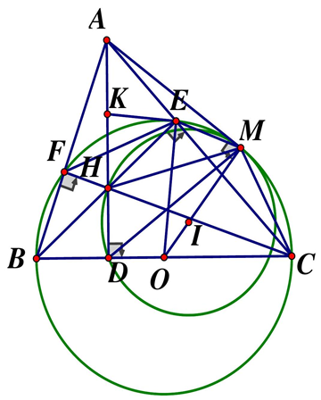Cho tam giác nhọn \(ABC(AB < AC)\), có ba đường cao \(AD,BE,CF\) đồng quy tại H. Vẽ đường tròn