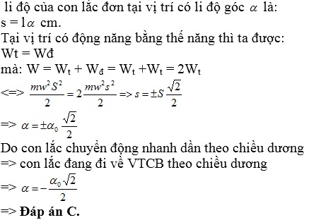 (ĐH – 2010): Tại nơi có gia tốc trọng trường g, một con lắc đơn dao động điều hòa với biên độ góc α0 nhỏ. Lấy mốc thế năng ở vị trí cân bằng. Khi con lắc chuyển động nhanh dần theo chiều dương đến vị trí có động năng bằng thế năng thì li độ góc α của con lắc bằng