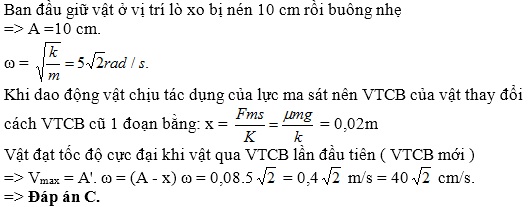 (ĐH – 2010): Một con lắc lò xo gồm vật nhỏ khối lượng 0,02 kg và lò xo có độ cứng 1 N/m. Vật nhỏ được đặt trên giá đỡ cố định nằm ngang dọc theo trục lò xo. Hệ số ma sát trượt giữa giá đỡ và vật nhỏ là 0,1. Ban đầu giữ vật ở vị trí lò xo bị nén 10 cm rồi buông nhẹ để con lắc dao động tắt dần. Lấy g = 10 m/s2. Tốc độ lớn nhất vật nhỏ đạt được trong quá trình dao động là