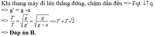 (ĐH – 2007): Một con lắc đơn được treo ở trần một thang máy. Khi thang máy đứng yên, con lắc dao động điều hòa với chu kì T. Khi thang máy đi lên thẳng đứng, chậm dần đều với gia tốc có độ lớn bằng một nửa gia tốc trọng trường tại nơi đặt thang máy thì con lắc dao động điều hòa với chu kì T’ bằng