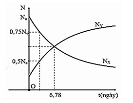 Khi nghiên cứu một mẫu chất có sự phóng xạ \(\alpha \) của hạt nhân X tạo thành hạt nhân Y bền, sự phụ thuộc của số hạt nhân X và số hạt nhân Y trong mẫu chất đó theo thời gian được biểu diễn như đồ thị ở hình bên. Biết rằng hạt nhân Y tạo thành nằm hoàn toàn trong mẫu chất. Tại thời điểm nào thì số hạt nhân Y lớn gấp 3 lần số hạt nhân X trong mẫu chất đó?