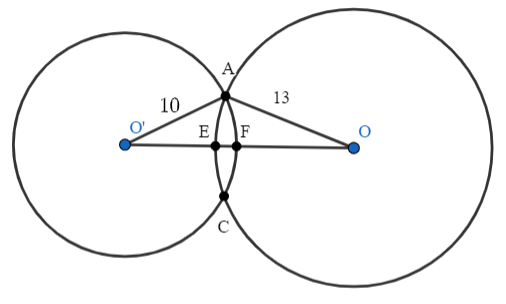 Cho hai đường tròn \(\left( {O;13{\rm{\;cm}}} \right)\) và \(\left( {O';10{\rm{\;cm}}} \right)\) cắt nhau tại
