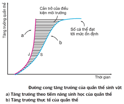 - Điều kiện môi trường không hoàn toàn thuận lợi: Tăng trưởng quần thể giảm (đường cong tăng trưởng hình chữ S).