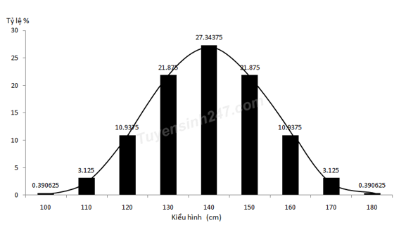 Một loài thực vật, chiều cao cây dao động từ 100cm đến 180cm. Khi cho cây cao 100cm lai với cây có chiều cao 180cm được F1. Cho 2 cây F1 giao phấn với nhau, thống kê các kiểu hình thu được ở F2, kết quả được biểu diễn ở biểu đồ bên. Tính trạng chiều cao của loài thực vật này di truyền theo quy luật