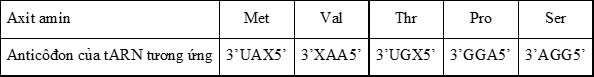 Một đoạn pôlipeptit có trình tự các axit amin: Met – Val – Ser – Pro – Thr –.... Bảng sau cho biết các anticôđon của các tARN vận chuyển axit amin trong đoạn pôlipeptit đã cho: