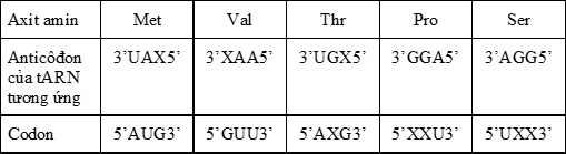 Một đoạn pôlipeptit có trình tự các axit amin: Met – Val – Ser – Pro – Thr –.... Bảng sau cho