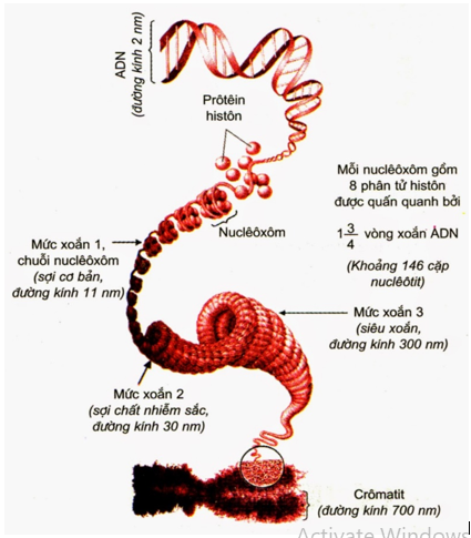 Một nucleoxome gồm một đoạn ADN dài 146 cặp nucleotide quấn \(1\frac{3}{4}\) vòng quanh 1 khối cầu gồm 8 phân tử protein loại histon.