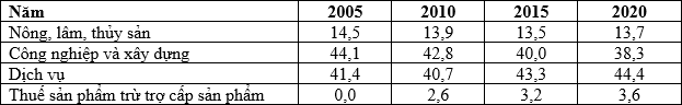 Theo bảng số liệu, cho biết nhận xét nào sau đây đúng về cơ cấu GDP của In-đô-nê-xi-a, giai đoạn 2005 2020?