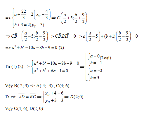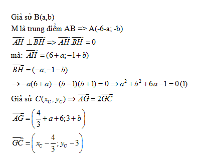 Trong mặt phẳng với hệ tọa độ Oxy , cho hình bình hành ABCD . Điểm M(-3; 0) là trung điểm của cạnh AB , điểm H(0;-1) là hình chiếu vuông góc của B trên AD và điểm G(4/3; 3) là trọng tâm của tam giác BCD . Tòm tọa độ các điểm B , D