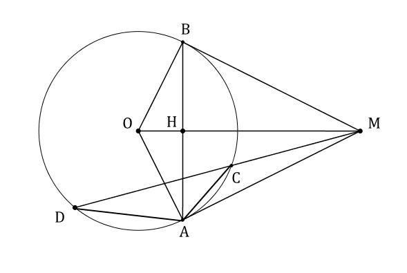 2. Từ điểm M nằm ngoài (O) kẻ hai tiếp tuyến MA, MB (A, B là các tiếp điểm) và cát tuyến MCD với đường tròn (C nằm giữa M và D, O và A nằm về hai phía đối với CD). Gọi H là giao điểm của MO và AB.