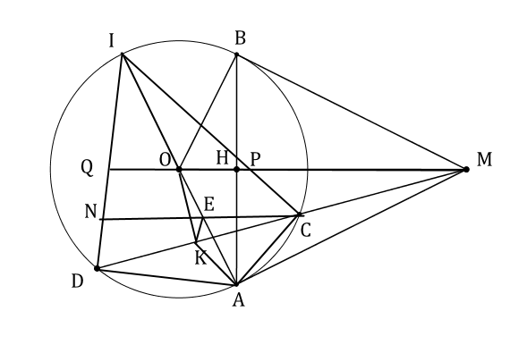 c) Kẻ đường kính AI của (O), các dây IC, ID cắt MO tại P và Q. Chúmg minh OP = OQ.