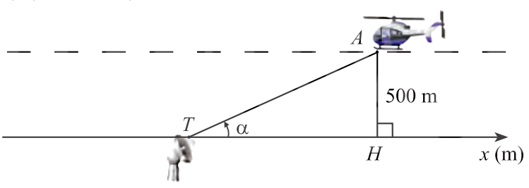 Trong hình bên, một chiếc máy bay A bay ở độ cao 500m theo một đường thẳng đi ngang qua phía trên trạm quan sát T ở mặt đất. Hình chiếu vuông góc của A lên mặt đất là H, \(\alpha \) là góc lượng giác (Tiếp xúc, TA)\((0 < \alpha < \pi )\).