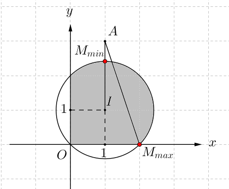 Cho \(x \ge 0,y \ge 0,x + y > 0\) thỏa mãn \({2^{{x^2} + {y^2}}} + {2023^{x - y}}.{\log _2}\dfrac{{{x^2} + {y^2}}}{{x + y}} \le {4^{x + y}} + {2023^{x - y}}\). Tìm tổng giá trị lớn nhất và giá trị nhỏ nhất của biểu thức \(P = {x^2} + {y^2} - 6x - 2y + 5\).