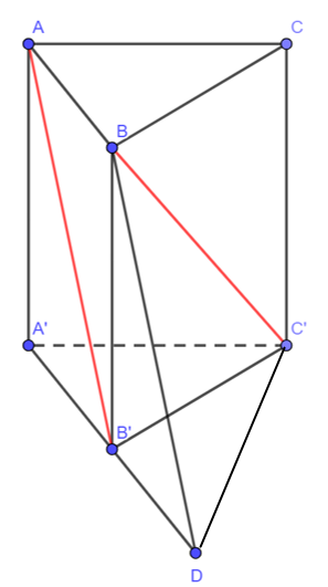 Cho hình lăng trụ đều ABC.A’B’C’ có cạnh đáy bằng a. Hai đường thẳng AB’ và BC’ vuông