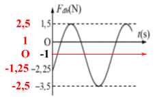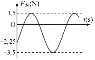 Một con lắc lò xo treo thẳng đứng với lò xo có độ cứng k = 25 N/m dao động điều hòa theo phương thẳng đứng. Lấy \(g = 10\,\,\left( {m/{s^2}} \right);\,\,{\pi ^2} = 10\). Biết gốc tọa độ O trùng với vị trí cân bằng của vật. Đồ thị biểu diễn lực đàn hồi tác dụng lên vật theo thời gian như hình bên. Tốc độ của vật tại thời điểm t = 0,5s là
