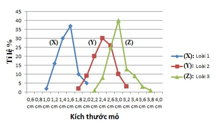 Xét 3 loài chim ăn hạt sống trong cùng 1 khu vực. Ổ sinh thái dinh dưỡng được thể hiện thông qua tỷ lệ phần trăm các loại kích thước mỏ của ba loài trên được biểu hiện ở đồ thị sau: