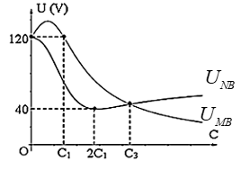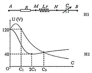 Đặt điện áp \(u = U\sqrt 2 \cos \left( {\omega t} \right)\,\,\left( V \right)\) vào hai đầu đoạn mạch như hình H1. Biết \(U,\,\,\omega ,\,\,R,\,\,L,\,\,r\) không đổi; điện dung C thay đổi được. Đồ thị biểu diễn sự phụ thuộc của điện áp hiệu dụng \({U_{MB}}\) và \({U_{NB}}\) vào điện dung C như hình H2. Khi \(C = {C_3}\) thì điện áp hiệu dụng \({U_{AM}}\) xấp xỉ bằng