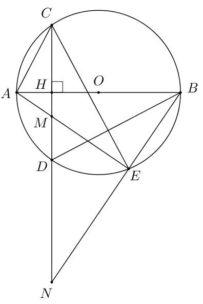 Trên đường tròn tâm O, đường kính AB = 2R, lấy hai điểm C, D sao cho CD vuông góc với AB tại H (H thuộc đoạn OA, khác O và A). Gọi M là điểm trên đoạn CD (M khác C và D, CM > DM), E là giao điểm của AM với đường tròn (O), N là giao điểm của hai đường thẳng BE và CD.