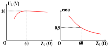 Đặt điện áp \(u = {U_0}\cos \left( {\omega t + \varphi } \right)V\)vào hai đầu đoạn mạch có RLC nối tiếp. Trong đó cuộn cảm thuần có độ tự cảm L thay đổi được. Hình bên là đồ thị biểu diễn sự phụ thuộc của điện áp hiệu dụng hai đầu cuộn cảm UL và đồ thị hệ số công suất của mạch cosφ theo cảm kháng ZL của cuộn dây. Khi \({Z_L} = 30\Omega \) thì điện áp hiệu dụng của 2 đầu tụ điện gần nhất với giá trị nào sau đây?