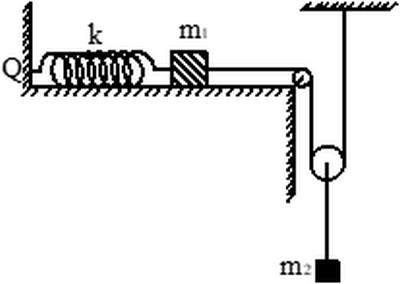 Cho cơ hệ như hình vẽ, biết \({m_1} = {m_2} = 400\,\,g\); k = 40 N/m. Từ vị trí cân bằng, nâng vật